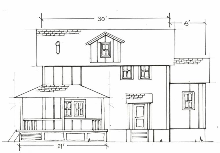 The drawing below by Brooks Stover is an interpretation of the photo of Bradley's house above. It has been compressed to fit the space on his layout but is intended to capture the character of the home. Notable features include the wrap-around porch and the single dormer. When the model is completed, photos will appear on STOVERS LAYOUT / Dundon. (Click on each view to enlarge)