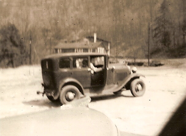 This photo was taken by Patsy Baughman around 1949. That's Herald Baughman and Roscoe Friend in Roscoe's dad's car. In the distance the roof and chimney of the Community Building is just visible. The creek is on the left and the road and railroad is on the right. The house visible above the car is that of Roy Drake who was a supervisor of rail maintenance in the Dundon area.