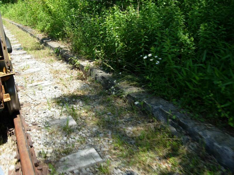 During the June 2007 trip in Nutter's Fairmont speeder, Roger pointed out this stone footing (photo, right) along the track near the site of Bradley's house. He said it was the foundation for the BC&G passenger platform. It can be scaled from the rails in the corner of the picture, but looks to be 50 feet long or more. It seems far bigger than the BC&G would have needed for passenger loading. Patsy Baughman, who grew up in Dundon and walked in the area of Mr. Bradley's house many times in the 40's and 50's is certain there was no station platform in this area during those years.