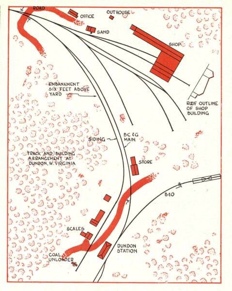 DUNDON SHOPS - The engine house, machine shop, sand tower and yard tracks, the ERC&L Dundon Headquarters and the later Yard Shops