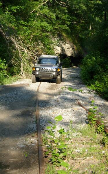 Along the main between the yard and the B&O station was a large cave cut into the rock cliff. Men would spend the night there waiting to get jobs with the railroad or at the mine. There is evidence of campfire smoke on the roof of the cave. The cave is visible behind the HUMMER which is sitting on the B&O main. The viewer is looking toward the Dundon Yard.