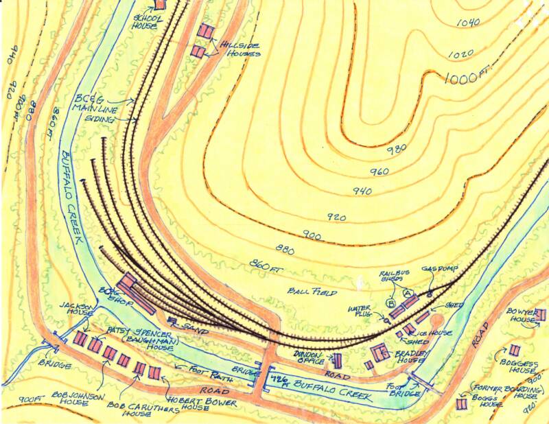 Here is the US Geologic Survey topographic map that Phil used as the basis for his maps. Notice that not all the structures nor all the track are shown here. With input from the Baughmans and through the study of photos, Phil filled in the details.