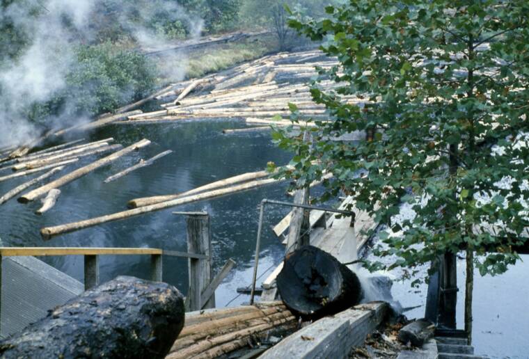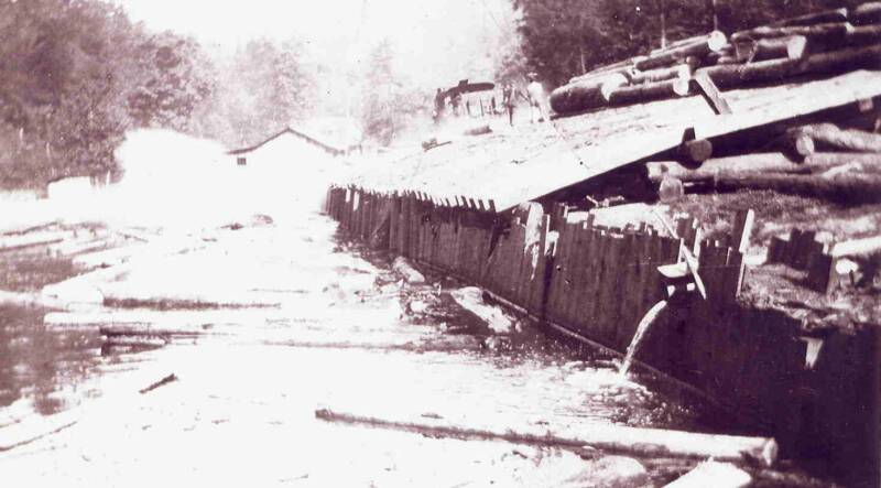 "How was the pond formed? I can only guess. Back in those days they used horses and scoops if they had a lot of dirt and rock to move. They most likely had to use dynamite to break up rock. Once they had the pond dug out they put heavy timbers around the walls. They also had a gate that could be lifted to drain the pond. Why this? Over the years the dirt and bark from the logs would fill the pond and the water would not be deep enough to float the logs efficiently. On days they cut only soft wood they would kick the hardwoods out of the way and if there was a build up of dirt around the edges the pond would be smaller. So we clean the pond. Lift the gate, drain the pond and flush out the pond with fire hoses. How often was this done? I have no idea...possibly every 10, 15, or 20 years.