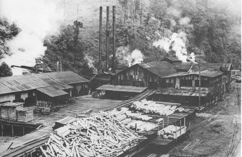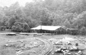 Cody provides this additional description: "The conveyor that carried the waste material to the burner went right by the boiler room. A man was stationed about half way out on this chain. He threw any slabs they wanted for the boiler room off of the chain and the excess slabs and material from the trimmer and edger in the mill went to the burner. The burner was just a big pile of waste, with no top, that burned day and night. It was across Buffalo Creek against a rock cliff. The conveyor chain was in a big wooden chute and us boys would play in this chute when the mill was not running. My first job at Swandale was cleaning the big mill after it would shut down in th evenings. I would get off the school bus and head for the mill. There was a large round tube from the planing mill to the boiler room that carried dry chips and sawdust to the boiler."