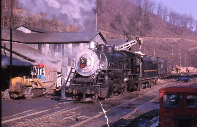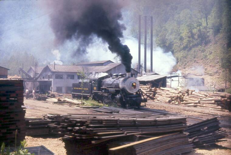 In September of 1963, just months before the Rich Run Mine closed, John Brown of Canada and some friends were railfanning the BC&G and caught this shot of #14 departing Swandale after her water stop. The now-dry log pond is clearly visible. The flat cars in front of the train are on the track that formerly ran adjacent to the log dump ramp. The sawdust loading conveyor is visible to the right in the photo.