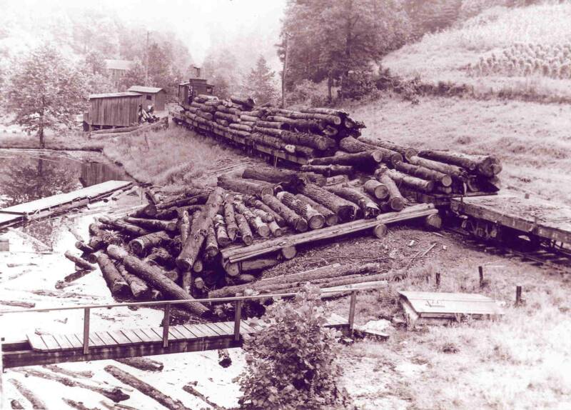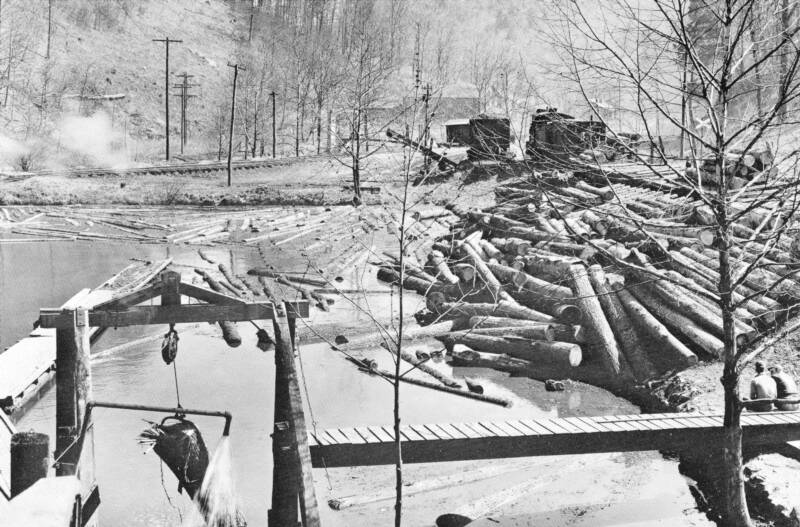 Cody Burdette has provided the following accounting about the forming of the log pond. He believes that the log pond was probably hand dug and it was fed from Barren She Creek by valves in the engine room of the sawmill. About once a year the pond was drained into the Buffalo Creek and a crew of men with shovels would shovel bark and mud out of it.