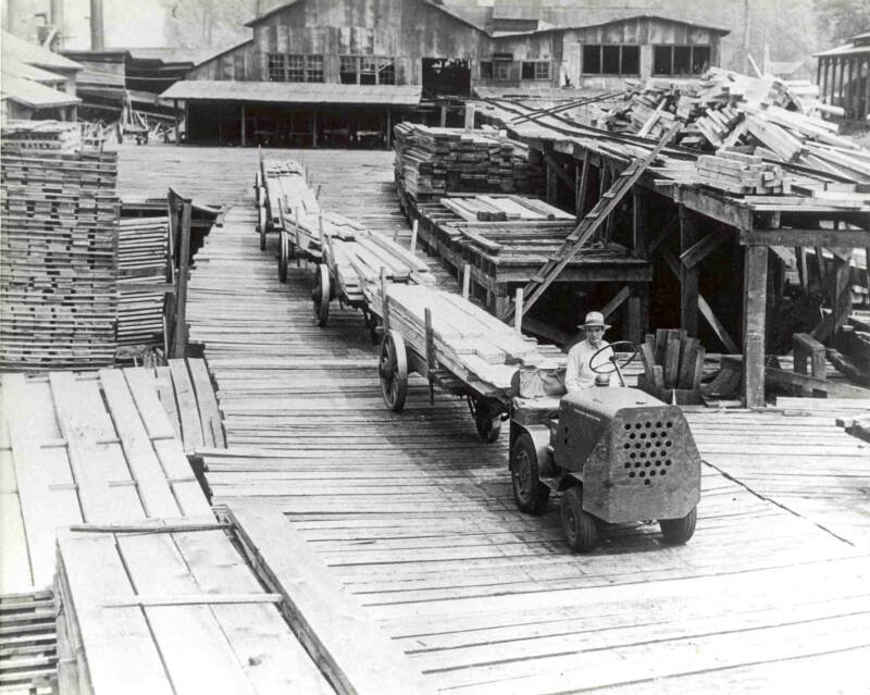 This facscinating photograph shows Freeman Nottingham driving the tractor with lumber carts in tow. Elvin believes this photo and the one above left were taken on the same day and it certainly seems like that could be the case based on the coloring of the mill. Just visible in the upper right corner is the open-sided engine house.