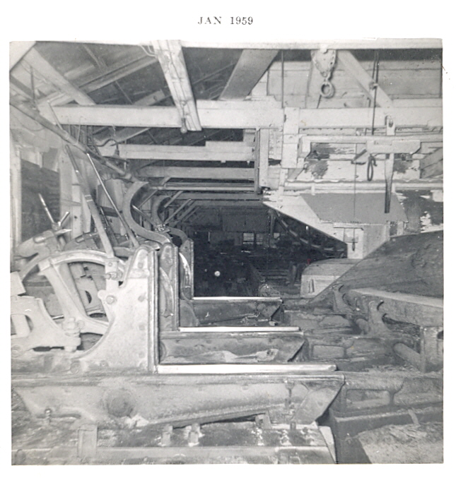 Elvin Frame has provided this rare photo of the interior of the section of the mill where the logs were cut into boards...a device called "the carriage'. The photo was taken in January 1959. Elvin states "a huge tapered round steel coil spring sat just behind the carriage which acted as a bumper in case the sawyer didn't stop th ecarriage on the return from another log or to saw another board.