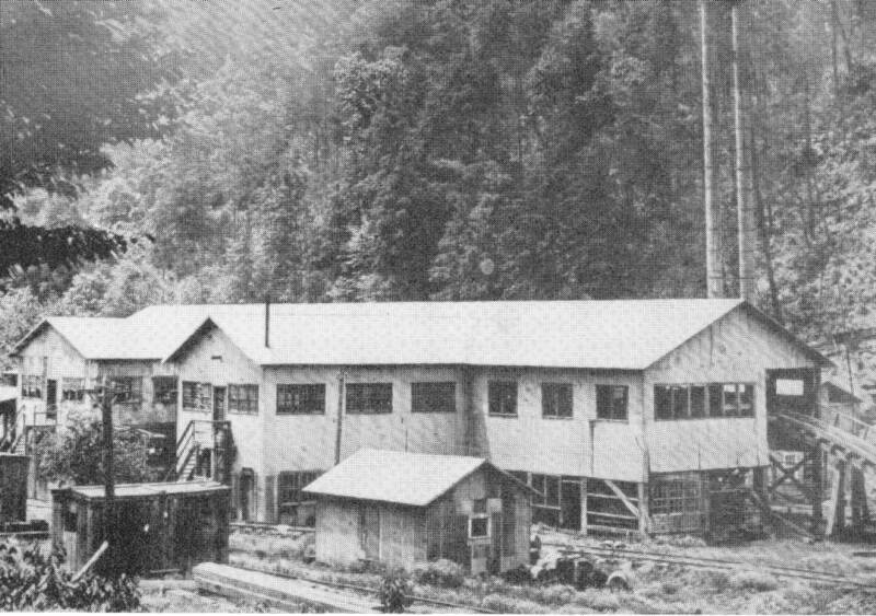 This photo shows almost the entire mill complex during the peak of operations probably in the 30's or 40's. Notice the rails on the platform for shuttling carts of lumber by hand to waiting cars or drying piles. The structure looks badly weathered in this view. This is the post-1930 "3 chimney" version of the mill.