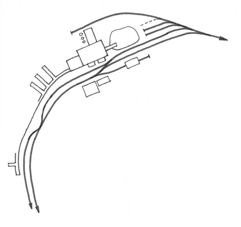 The crossover arrangement is shown here as it was in the 1930's. In the 1950's the lower crossover didn't exist (see photo above). Cody Burdette recalls that siding G held about 20 or 25 cars. See also Landis Jarvis description below.