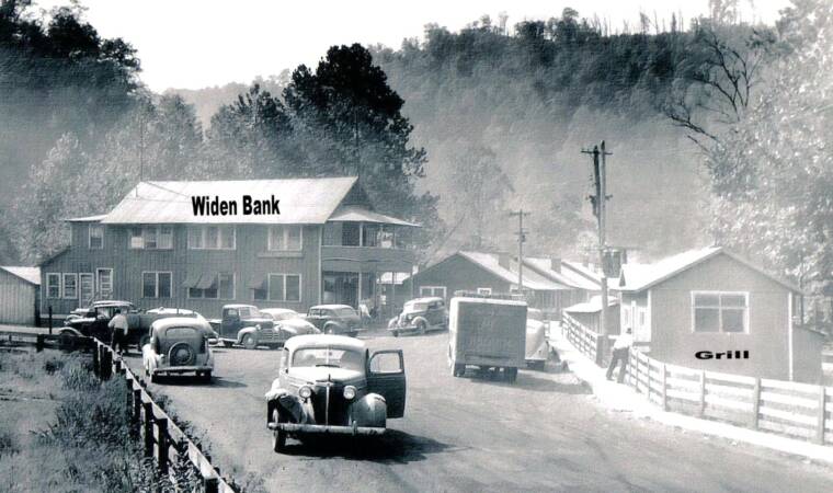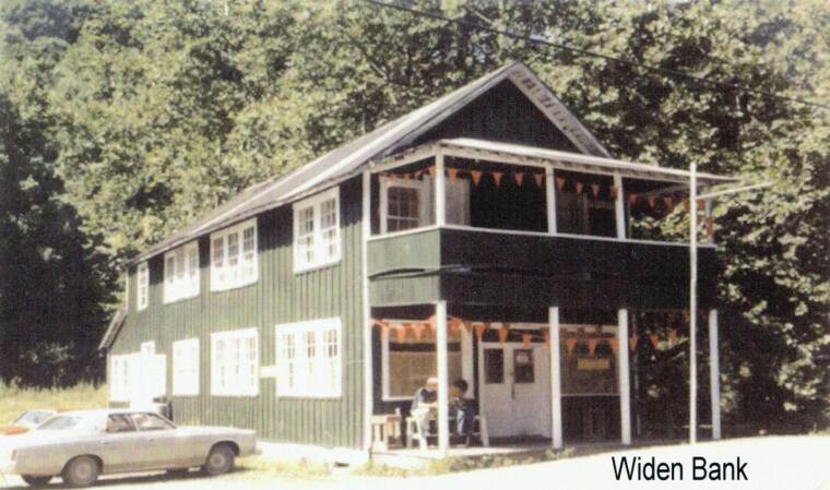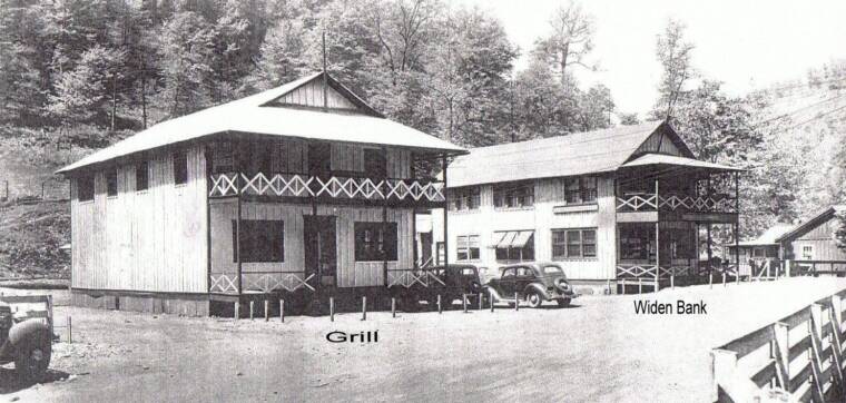 The Bank at Widen was established in 1918. According to Widen, An Appalachian Empire, Book 1, it was originally located "in a building that had been a pool room". Theodore Griffith of Dille suggests that is not correct and that the structure was originally built as the bank. The four photos (1 through 4) are believed to be in chronological order. The first two are undated, the third from 1956, and the fourth is from some time after the sale of the company. At this time the building was now a restaurant.