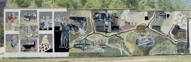 Theodore Griffith provided this photo of a mural painted on the side of a of the new company store which was built in 1956 or 1957. This building was located adjacent to the high school and was the first building encountered when entering Widen. Prior to this, the store had been housed in a portion of the gym of the YMCA following the destruction of the original store by fire (see top of page). The mural was painted in the 1970s and shows a map of the town with images of key events from the towns history. The building and mural were taken down in the mid-1980s.