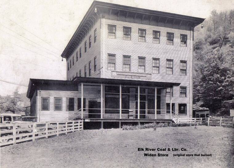 The original Widen company store was built in 1912. An expanded version of the store was opened in February 1921. This building contained 9 departments including a meat shop, beauty salon, soda fountain, pool hall and the post office. According to Widen - An Appalachian Empire, Book 1, it was destroyed by fire in 1941. Theodore Griffith believes the date was 1939.