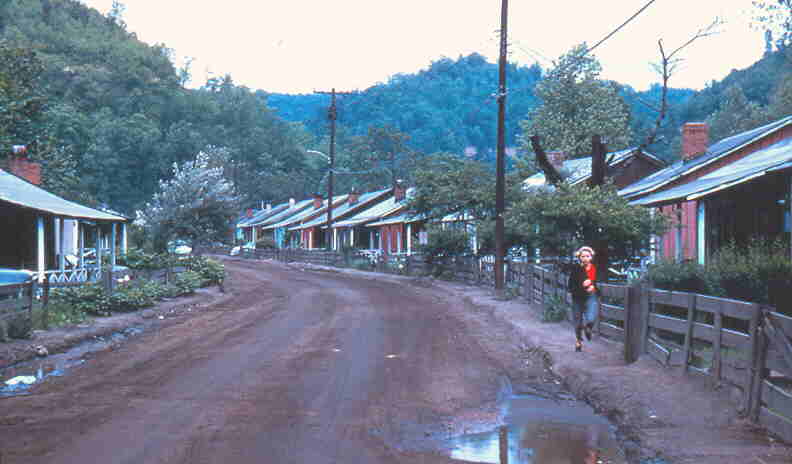 In the photo on the right from the late 60's or early 70's many of the houses are boarded up. You can just make out the word "sandwiches" on the old bank building, now a restaurant. The large wooden company store stood just to the right of the open space in this photo (A)...see 1925 photo to the below. The tipple was down the track behind the company store.