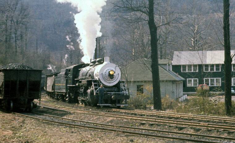 This photograph was found on the internet. It is dated April 1962 and is copyrighted by Tom Sink. I've placed it here on this page because the location is similar to the 1925 photo above. The former bank building, by now a grille, is the green building in the background It can be compared to photos of the bank above. The grey building behind the engine is the Widen Fire Station. In any case the photo is a classic and the ever-present crew member is standing on the pilot of a spotless #4.