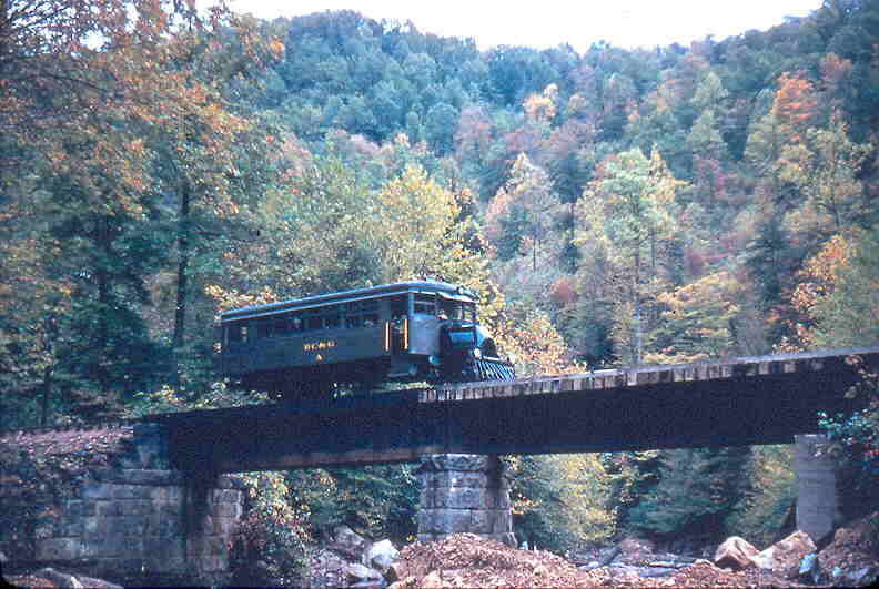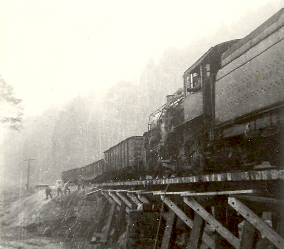 This photo shows the temporary repairs to the Sand Fork Bridge. Repairs were not completed until April 1960, some eight years after the dynamiting! This is a fantrip crossing the temporary wood trestle. It appears the new concrete pier is in place. J.J. Mannix collection.