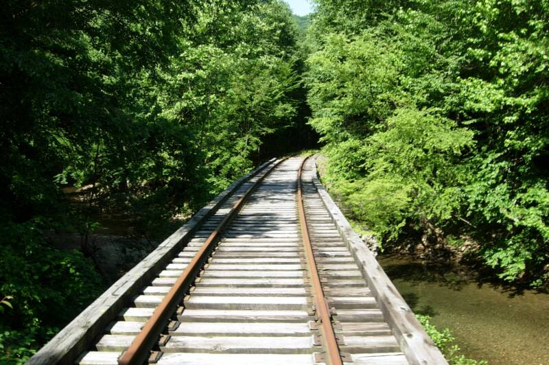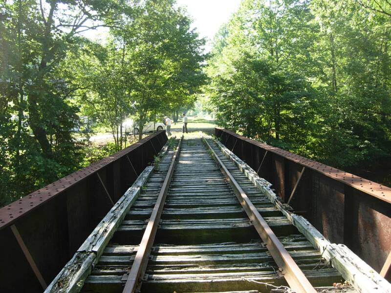 The bridge is in pretty good condition since it hasn't been used for rail traffic since 1965, I don't believe. The railings were added for the safety of hikers. The clearing for the former trackage is visible in the trees.