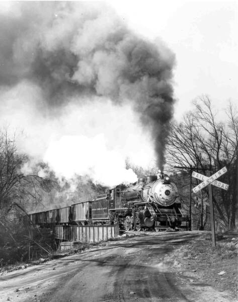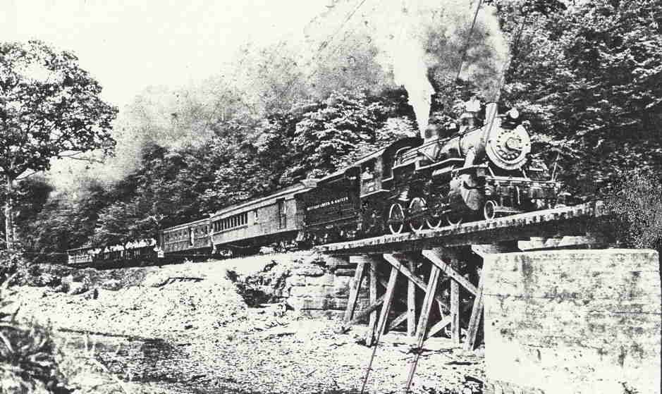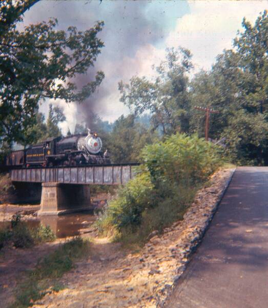 Here is a wonderful and rare color photo by John Brown of the Cressmont bridge. For the modeler it provides a great view of the cut stone pillar, looking all the world like a Chooch item! Note the crew member riding outside on the pilot as was so often done, and the striking similarity to the Bill Price photo above right.
