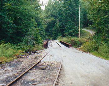 Jerrold Murphy has provided some great insight into these two photos of the Swandale bridge. The upper picture, which is looking from the direction of the company store, shows the area that would have been right in what was considered the town of Swandale. This photo was taken after the sale of the ERC&L as lumber (see stack to left of road in distance) was not stacked here when the ERC&L was in control. Notice, too, that there is a motor vehicle bridge running right next to the railroad bridge. Compare this with color photo below. Jerrold says the house on the right is where his grandfather, Curt Murphy, lived.