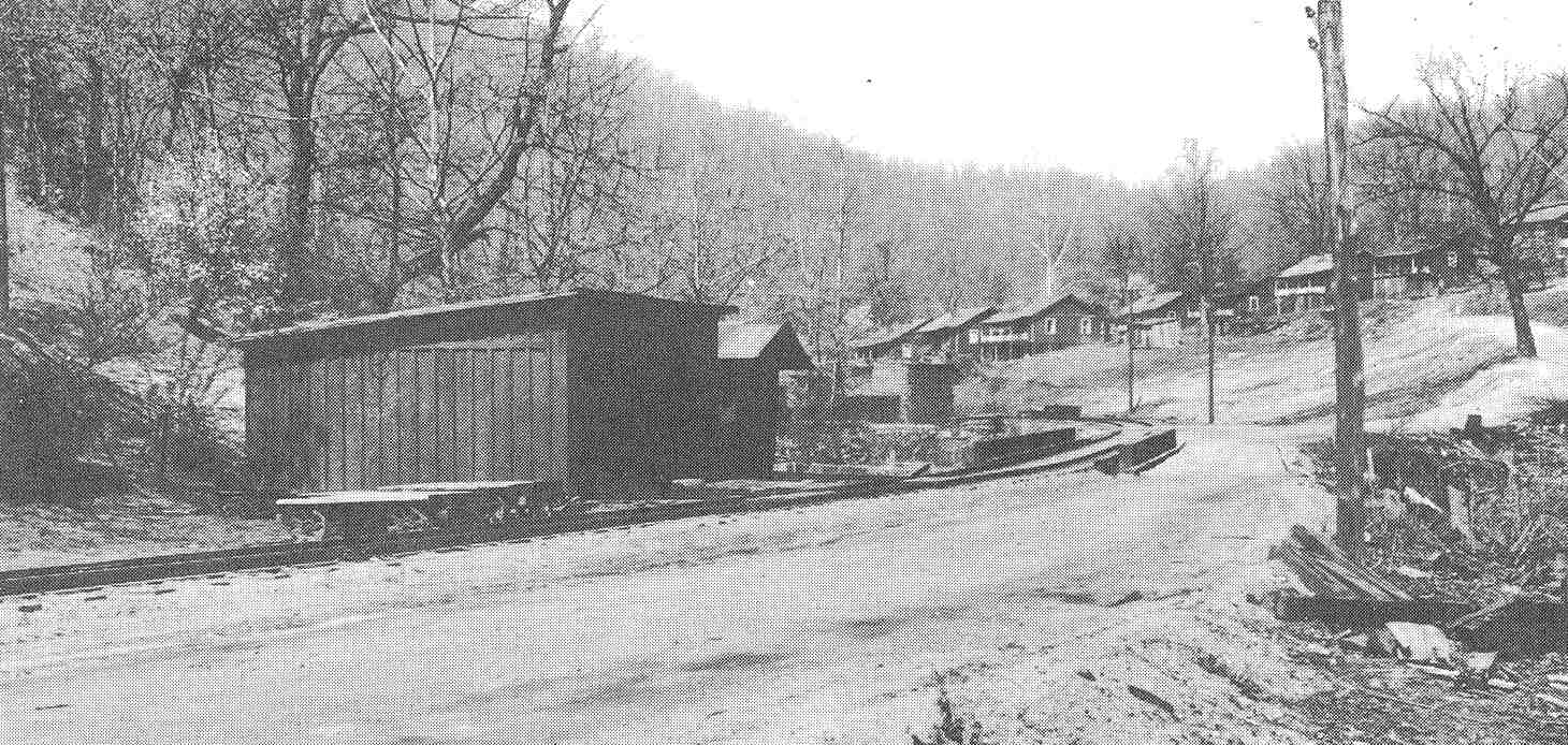 The lower photo, taken at about the same time, is looking in the opposite direction, toward the company store and mill. The shed nearest the camera housed a speeder and the guard shack is just behind it. By enlarging the photo you can see that a street runs up the hill to the right across the hill. Jerrold says the hill was known as "May's Hill", believed to be named after an early superintendent of the mill.